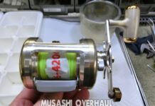最後は ハンドルナット を締めまして完了です。今回の代金は 5,000円+パーツ代金 でした。リールのオーバーホール&メンテナンス、修理チューンはお任せください。リールは大切に!修理オーバーホールの申し込みは こちら からお願いします。