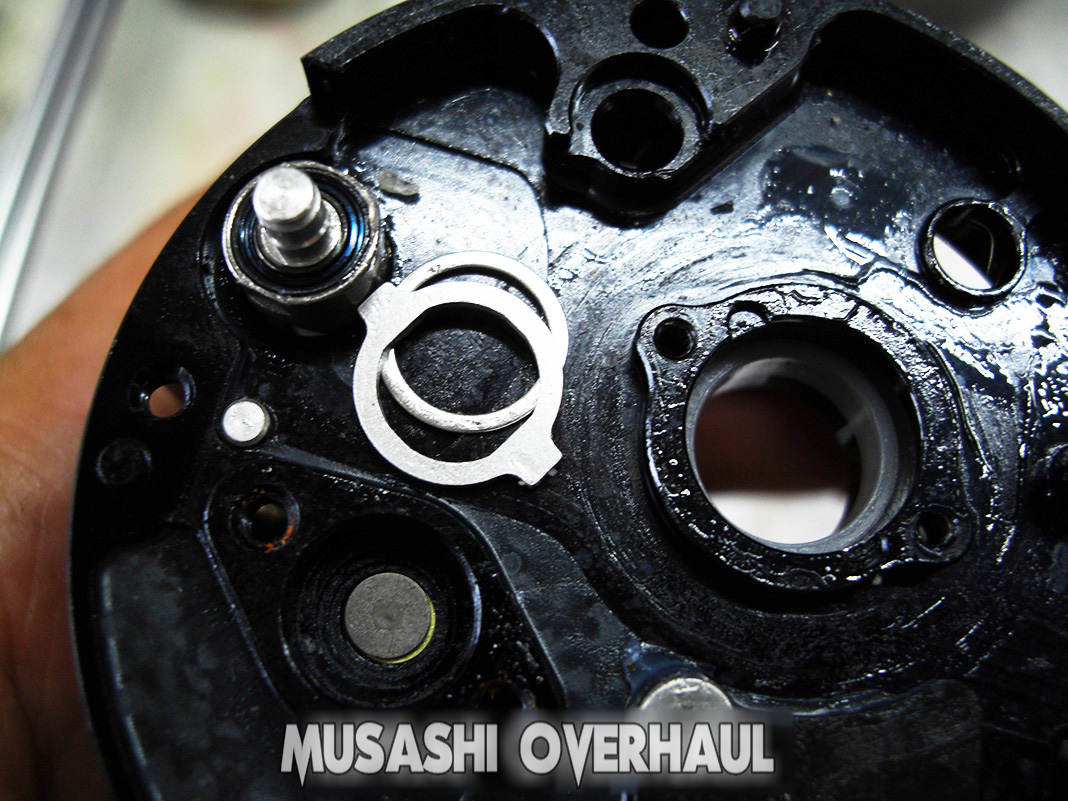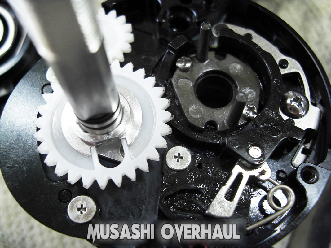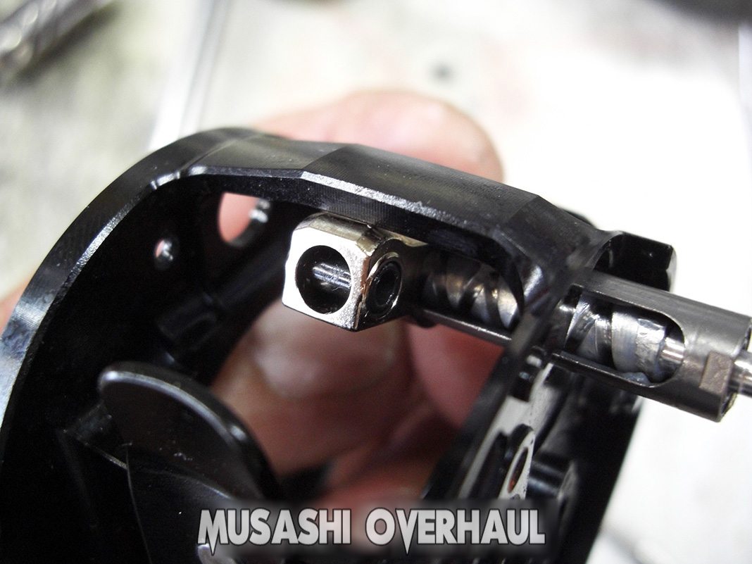 こちらのリールですが、ハンドルを回すとある部分のみ「ガタン」と詰まりが発生している様子。どうやらレベルワインド周辺から異常があるようですが…