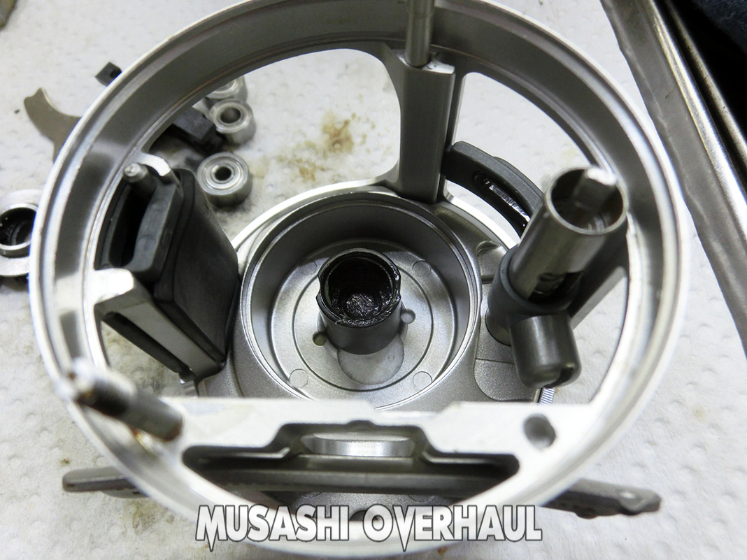 ボディも磨きます。最後に全体的な調整を済ませて完成です。今回の代金は 5,000円+ベアリング代金 でした。リールのオーバーホール&メンテナンス、修理チューンはお任せください。リールは大切に!修理オーバーホールの申し込みは こちら からお願いします。