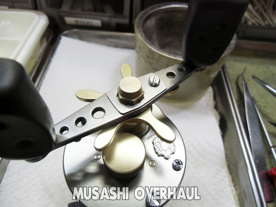 写真のような スペシャルツール(非売品) を使用します。ベアリングの スリーブ中心 に圧をかけてゆっくり引くものですので 裏側にも あて筒をして ボディ には一切 負担がかかりません。他にも カルコン や コンクエスト等 といった リベットで受けが固定されている アルミボディ には マストツール です。