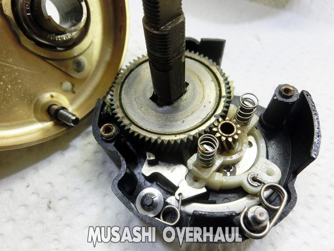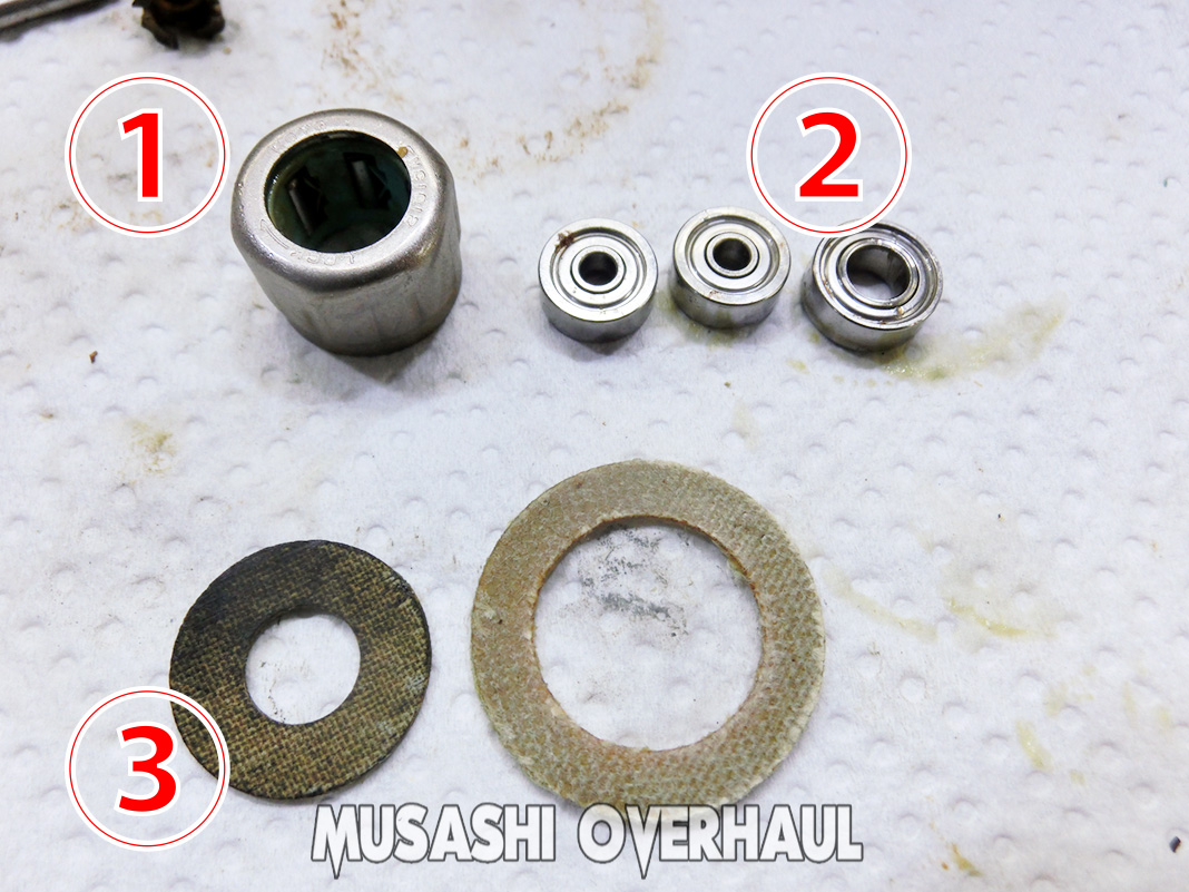 今回の交換するパーツ類です。左上から ①ワンウェイクラッチベアリング ②ボールベアリング ③ドラグワッシャー となります。いずれも過度の使用期間を過ぎており交換が必要となります。