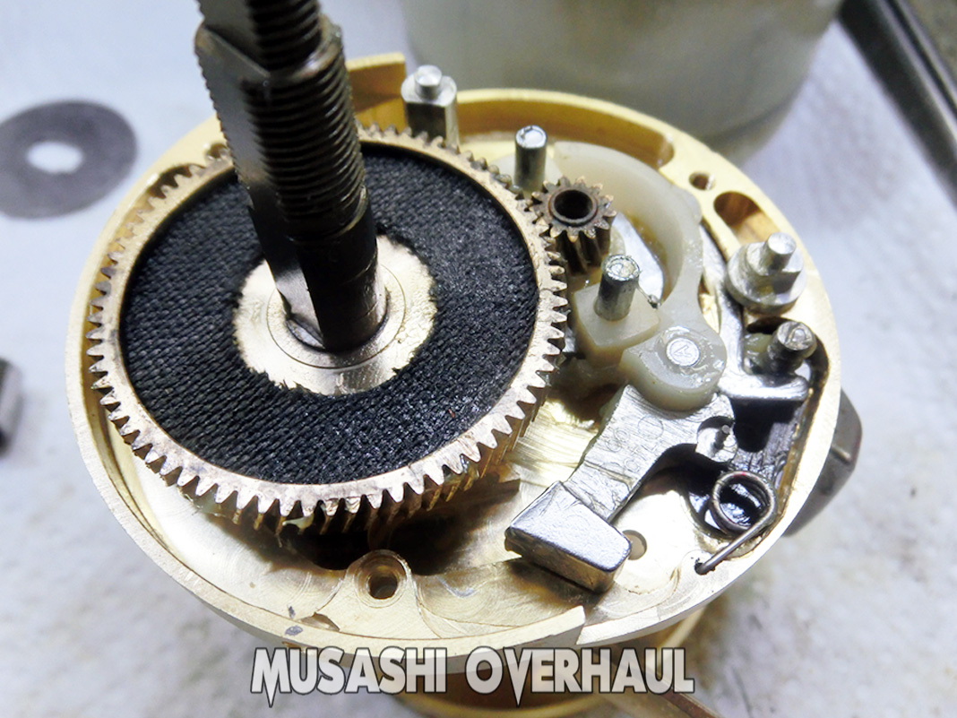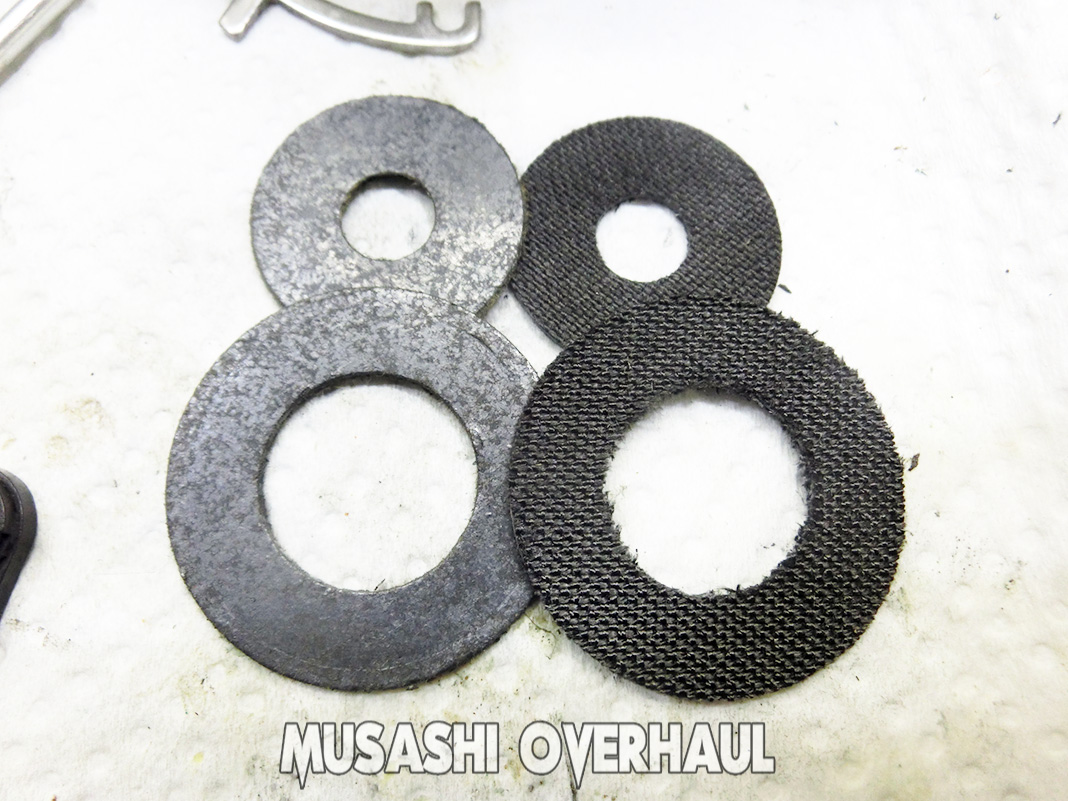 ドラグワッシャー(上)もペッタンコになってしまっています。2008年くらいまでの シマノ製リール には これらのカーボンドラグワッシャーは使用されておりませんでした。換装するととても素晴らしいパフォーマンスが得られます。ご希望の方は こちら で購入できます。
