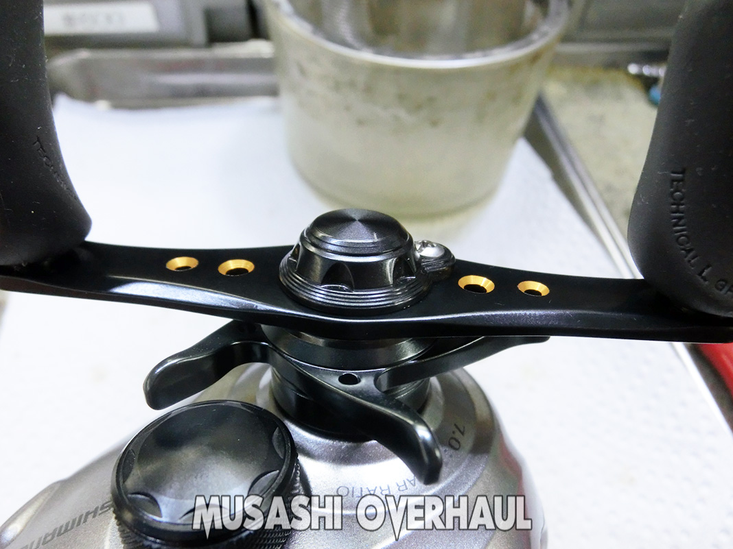 最後にハンドルをセットしまして完了です。今回の代金は 3,500円+ベアリング代金 でした。リールのオーバーホール&メンテナンス、修理チューンはお任せください。リールは大切に!修理オーバーホールの申し込みは こちら からお願いします。