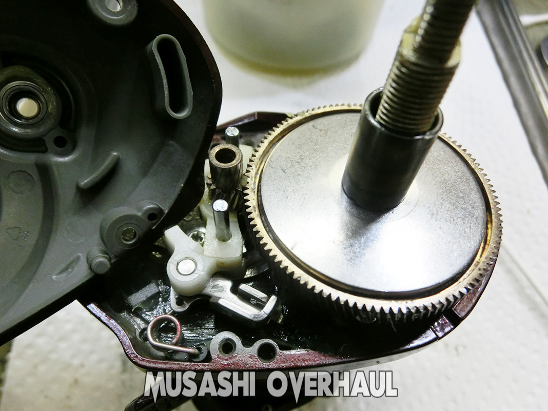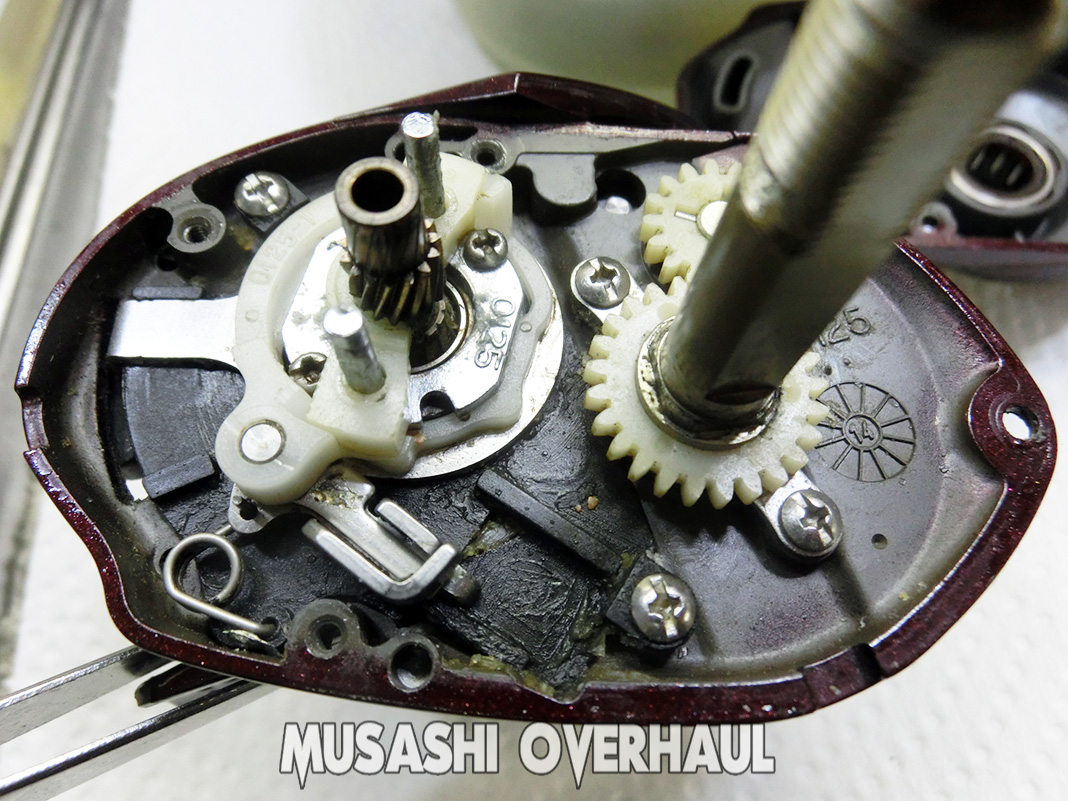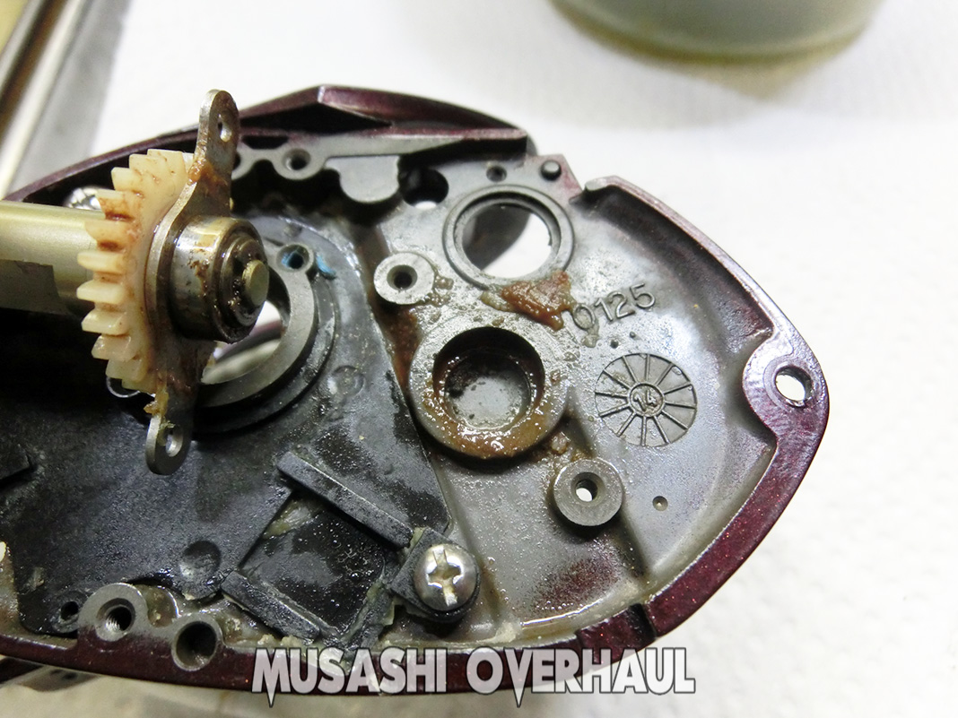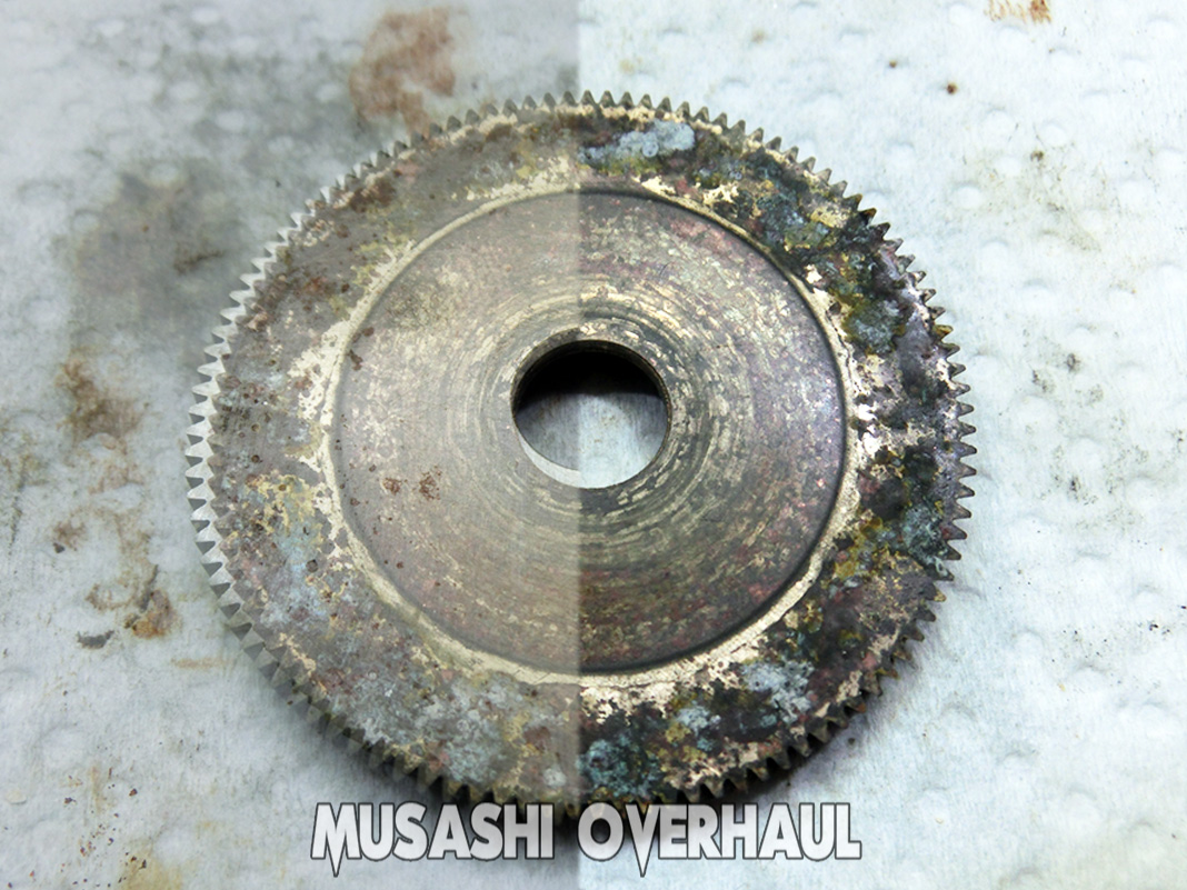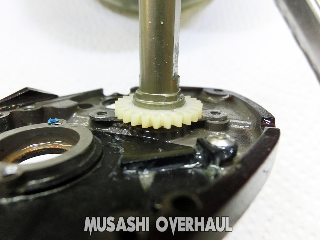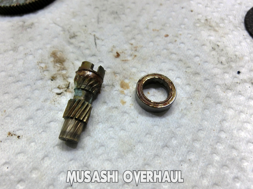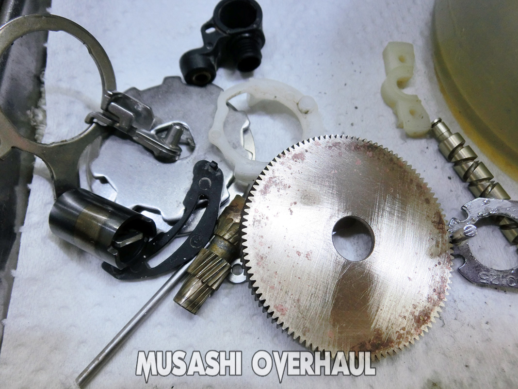 こちらのベアリングも錆びておりました。ピニオンギアも錆びていたので汚れを落とします。