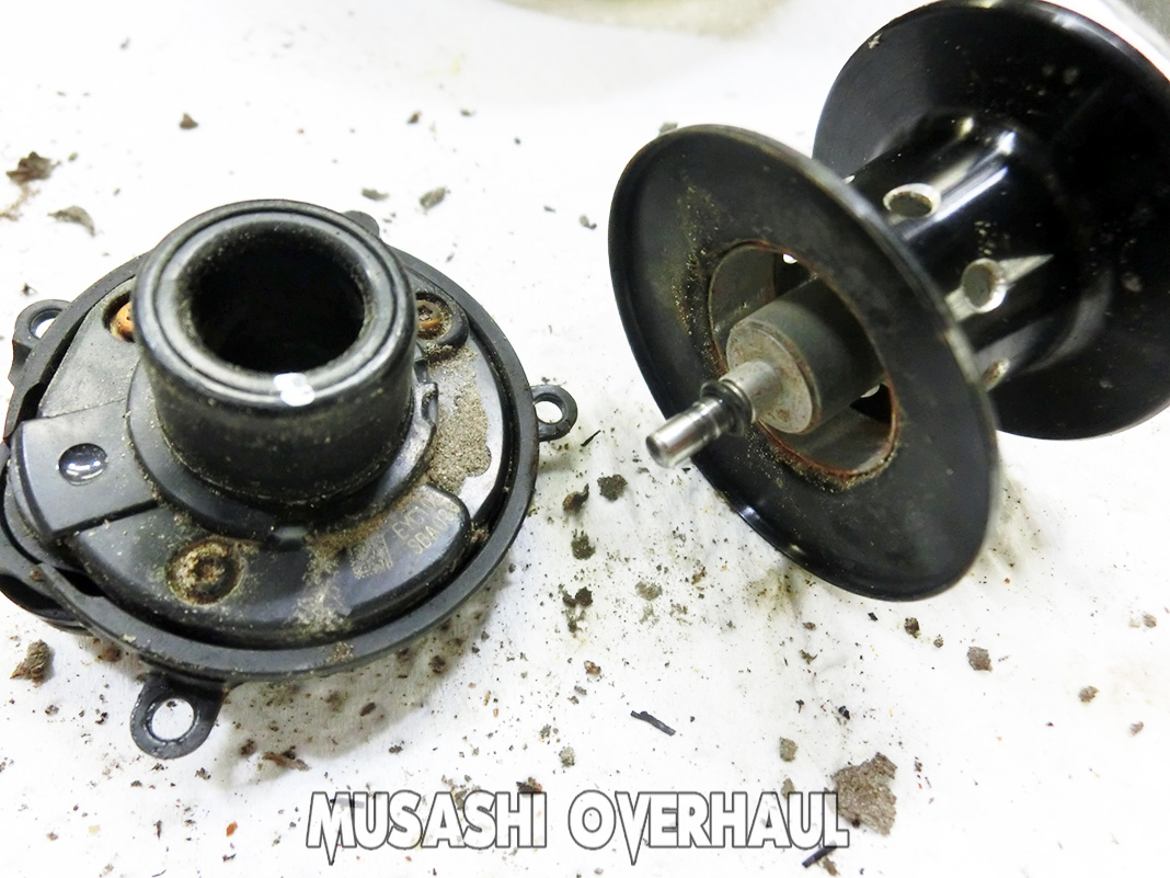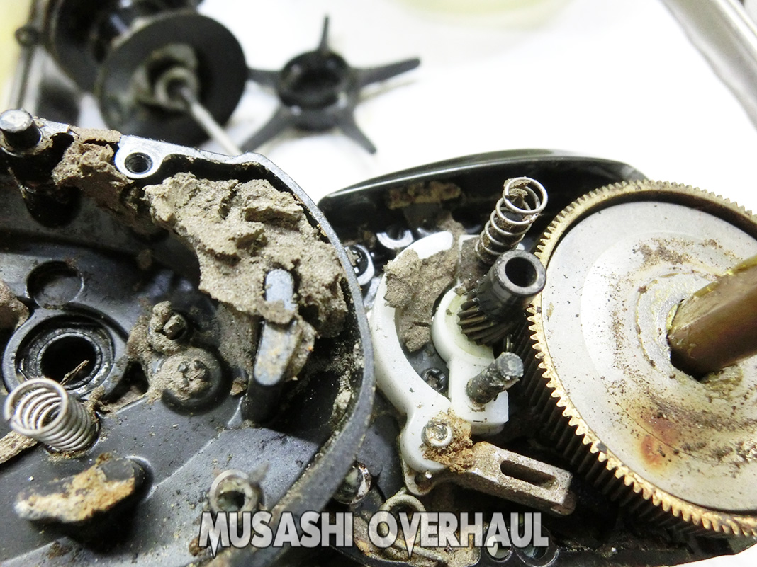 内部からは大量の砂が出てきました。DC機能が壊れていないか心配ですね~ このまま 巻いたらスプールが傷だらけ ギアやレベルワインドが欠けてしまうかもしれませんね。こういう場合は一度 バラバラにして 再度 組み上げで直ります。[リールの水没 関係事例]