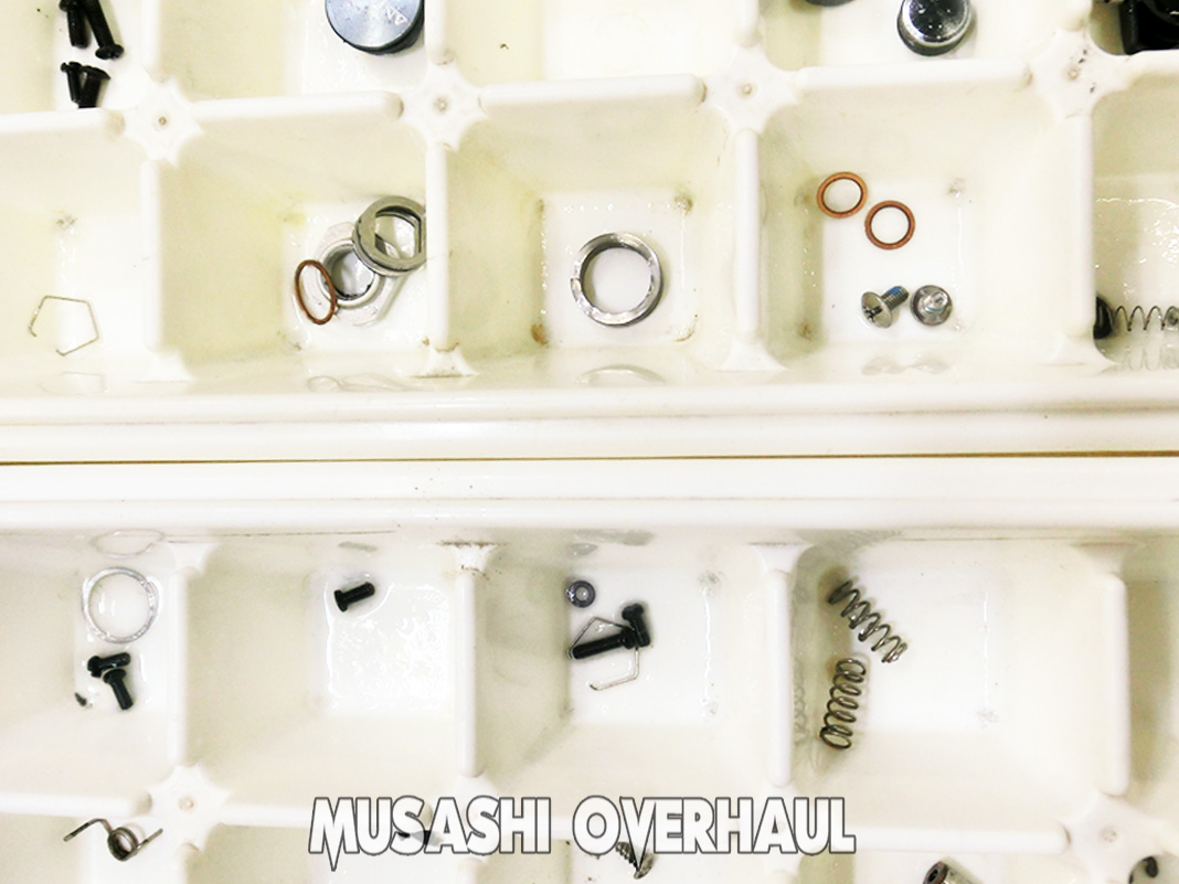 オーバーホールの基本ステップは以下の通りです:①完全バラ ②完全洗浄 ③完全磨き上げ が基本です。[展開図]