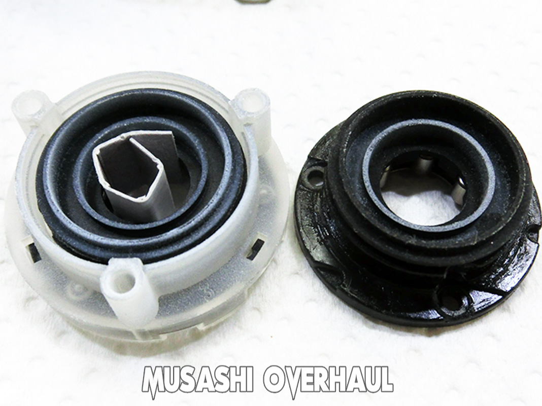スピリングリール は ベイトリール のように普通の 知識感 では 上手く 分解メンテナンス できません。(この辺は企業秘密みたいな業界ですが… ) 写真のような 傘歯車(ベベルギア) が メイン で セット されて回っています。この ギア を支えているのが 上下左右 の一箇所 ずつの ベアリング です。普通にセットして回れば 問題はないのですが これに「巻き心地」や「軽さ」「重さ」なる人間様の 感覚 が絡んできます。それらの 調整 を行うのが シム とよばれる 薄型 のワッシャーです。それら の薄さ を使い分けて 圧を入れたり 逃したりします。0.1mm単位 で 表情が ガラリと 変わるので 非常 にやっかいです。