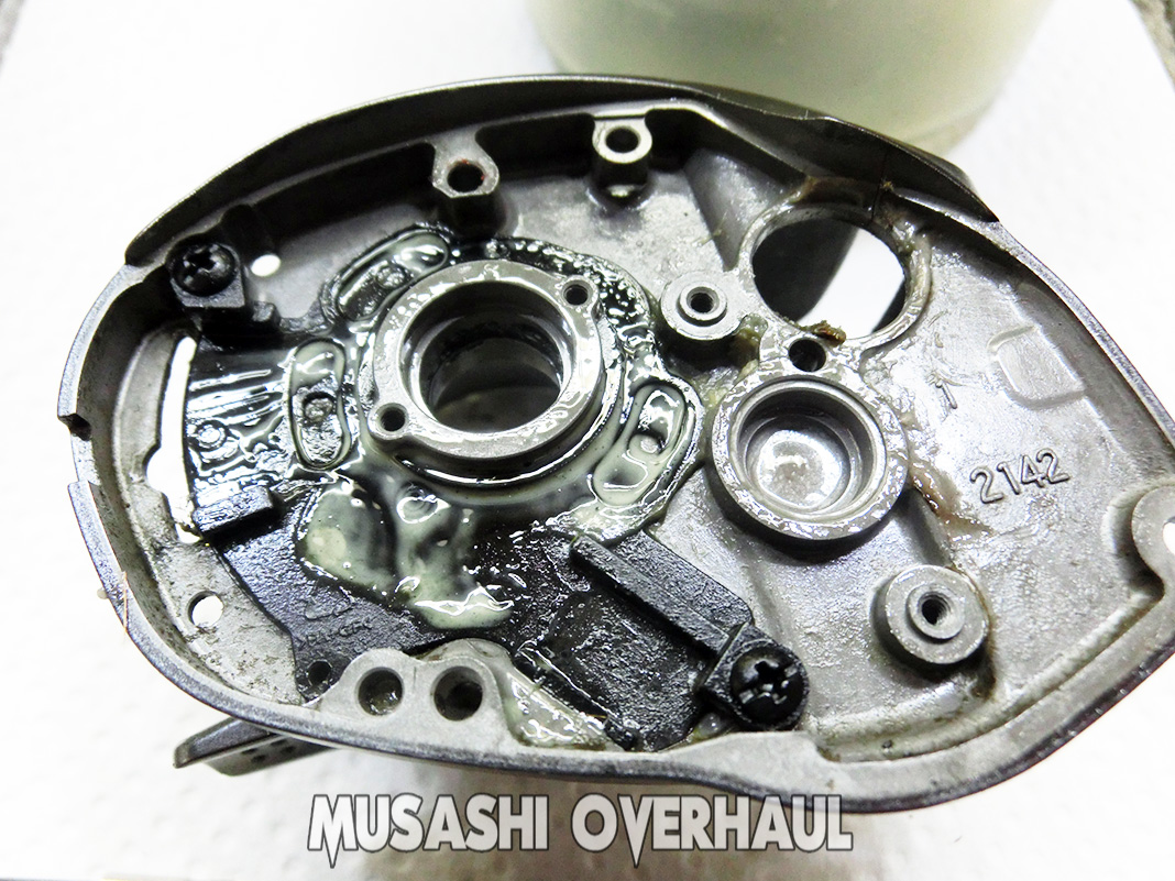 内部のグリスは乳化しておりました。このまま使用すると 潤滑性能が著しく低下し、機械の摩耗・損傷、錆の発生、さらにはグリスの流出による致命的な故障を引き起こします。特に、内部の金属部品が直接摩擦し、ベアリングの破損や異音の原因となるため、速やかな交換が必要です。