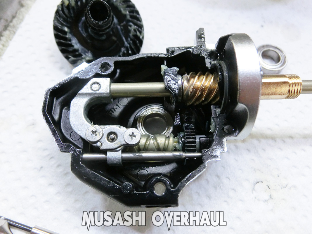 今回入れる(前回はいっていた) ベアリング幅 4.00mm に対して 実測は 3.99~3.98mm 幅 なので サイドベアリングを2つ交換した場合は 0.3mm位の クリアランス が発生します。この調整をしないで リール を組み上げた場合は ギア に 古い跡 と 新しい跡 がついてしまい おかしな フィーリング になってしまいます。(キリキリ鳴ったり、途中、ガッコンと落ちます) また新しい ギア を入れる作業も同等の 調整 が必要となってきます。