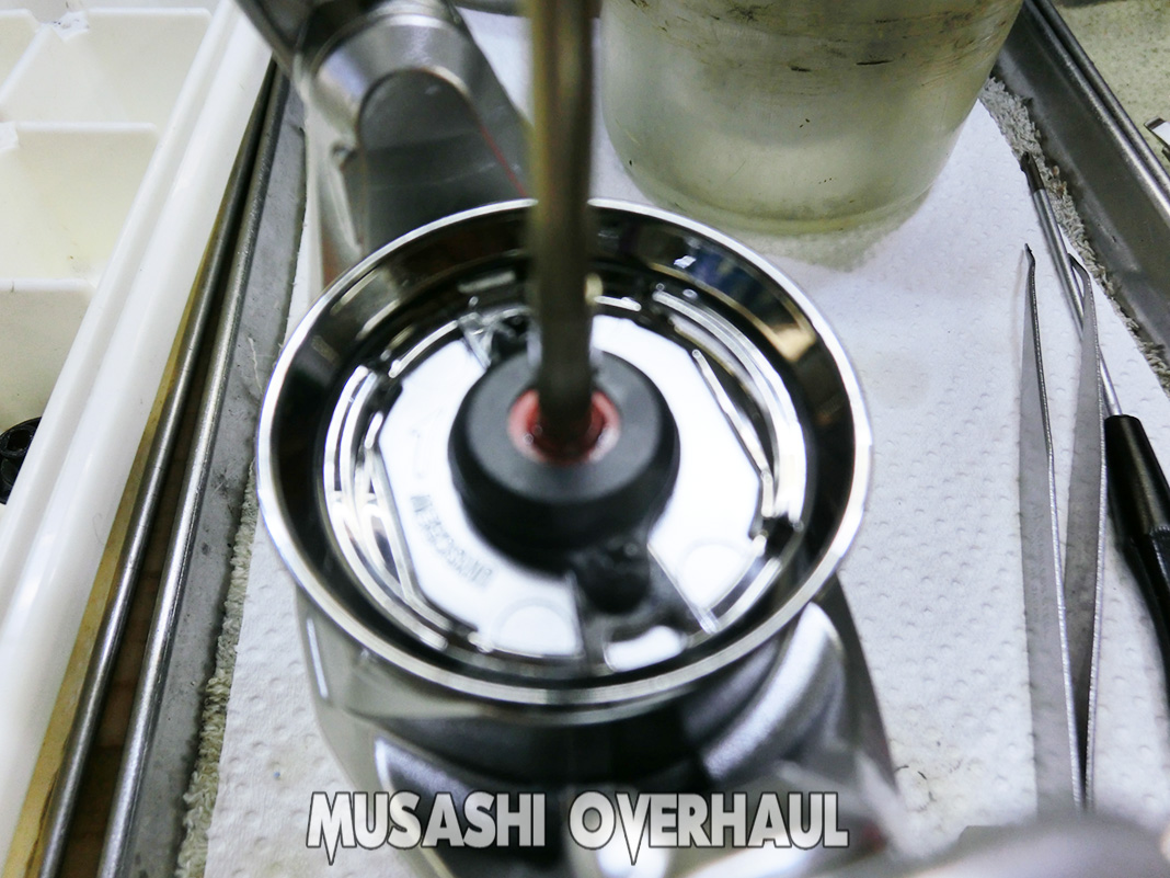 今回は ベアリング を新品に変えるので ベアリング公差(はめあい) なる調整を行います。これは ステラ や ヴァンキッシュ 等の スピニングリール には 傘歯車 が 使用されており 密接精度 が高く 調整が しっかりとなされているので 新しい ベアリング を入れると フィーリング や ギア圧 が変わってしまいます。また 古いグリス(垢)を落とすという事は 痩せてしまう という表現でもいいかもしれません。最終的なシム調整幅は 0.1~0.5mm にて 行っています。俗にいう バックラッシュ の調整です。