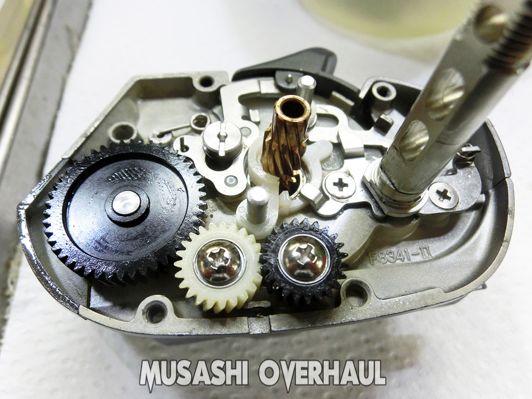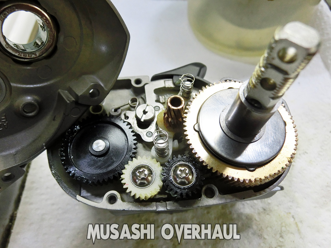 グリス も ガビガビ に乾燥しておりました。こちらのリールはご覧のように 歯車(ギア) が一つ多い 設計 なので メンテナンス は重要です。グリス類が 重くなれば 重さも 重くなります。