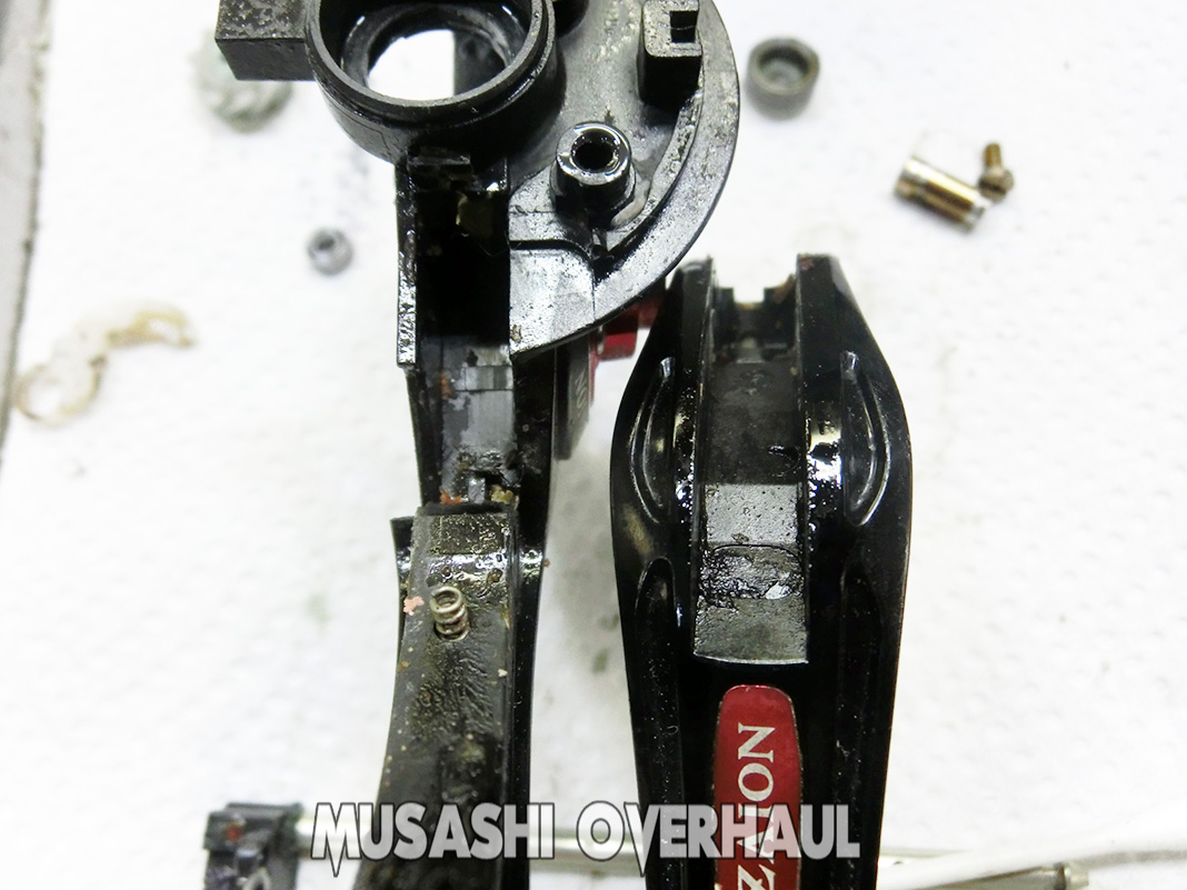 磯物系スピニングリール は 磯際でかけた魚が 急に根に走った際に ブレーキをかけれるようにと レバー型の ブレーキシステム が組み込まれております。これが結構な複雑なモノで自身で触ってしまい壊してしまう方が居られます。こんなに汚れが溜まっております。注意が必要ですね涙