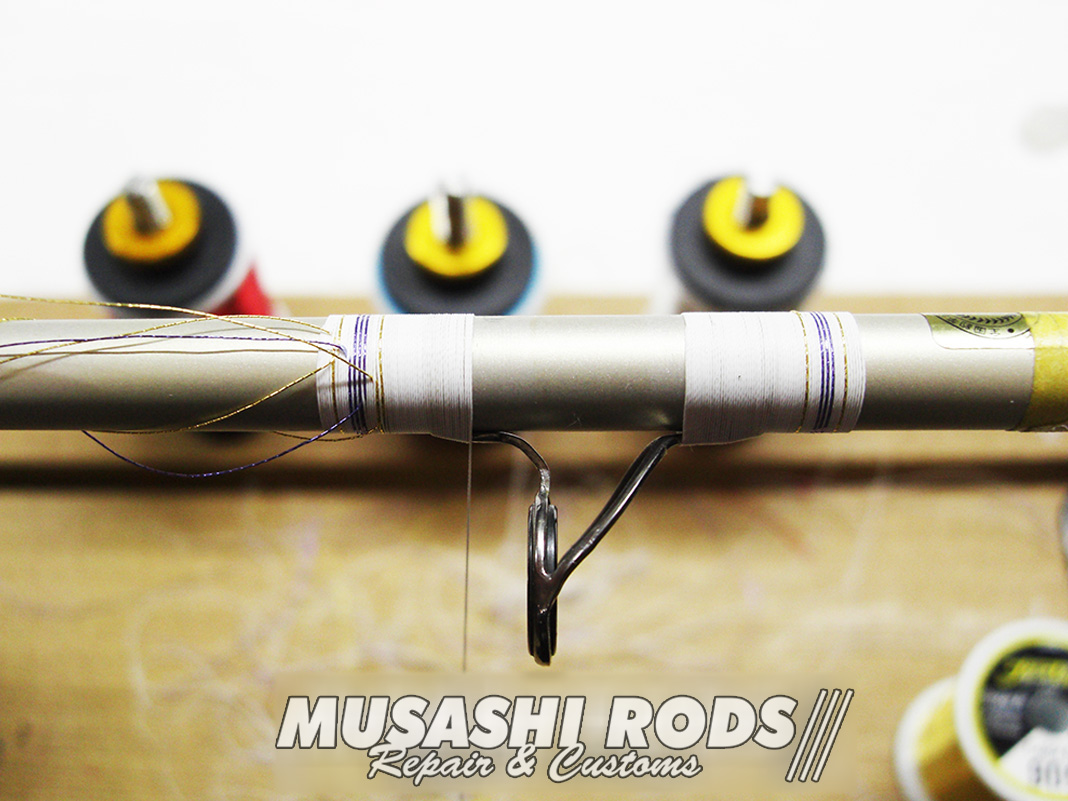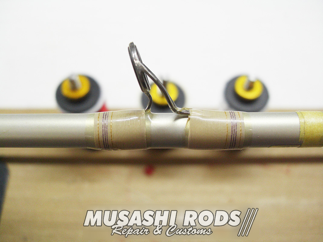今回は ダイワ ハートランドZ HL-Z 691MHRB-07 白疾風 (01402127) のガイドを修理巻き直します。写真の様にガイドが飛んでしまった様子。ガイドは使い手が知らないうちに 曲がったり割れたりしてしまいます。ムサシロッド リペア&カスタムズ では あなたのロッドを希望通りに カスタム 致します。