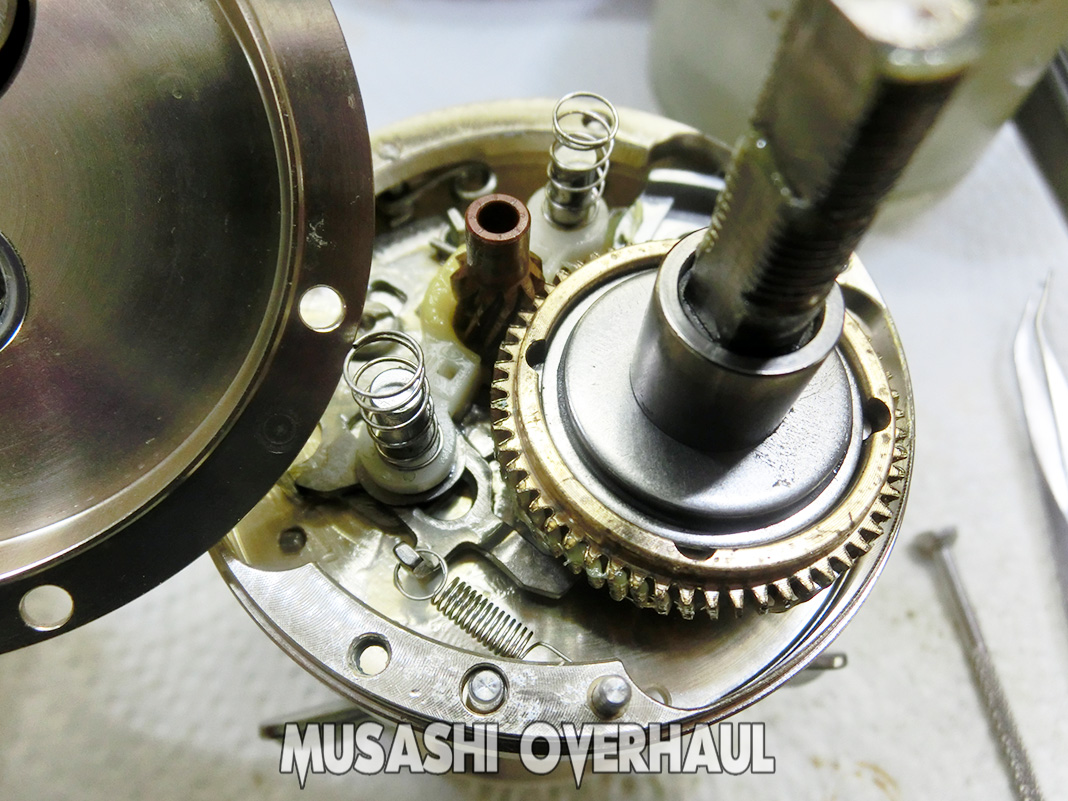 原因を発見しました。部品番号 50番 ボールベアリング の錆びでした。よくある症状ですね。とても少しの錆ですが リール の場合は繊細なので かなり酷いレベルです。異物混入に関しては こちら にて纏めていますので参考ください。