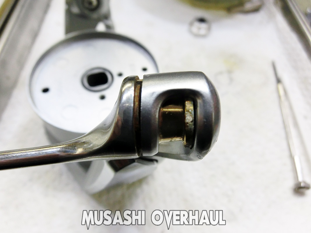 塩粒 が ポロポロ と落ちてきました。各部は 錆びが酷くて ガタ が発生しておりました。これぐらいの見た目、車 や バイク でしたら普通ですが リール の場合は繊細なので かなり酷いレベルです。錆害に関しては こちら にて纏めていますので参考ください。