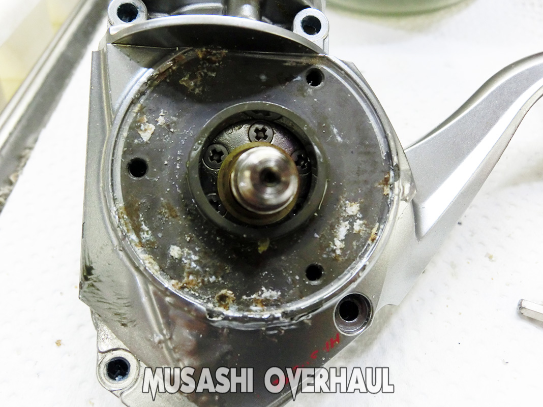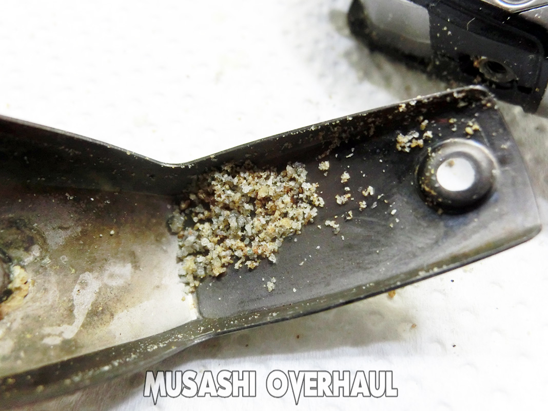 まずは オープン です。内部から大量の砂が出てきました。リールの性能は大変良いのですが こんな砂が内部に入ってしまったら ギア類は全てダメになってしまいますね。