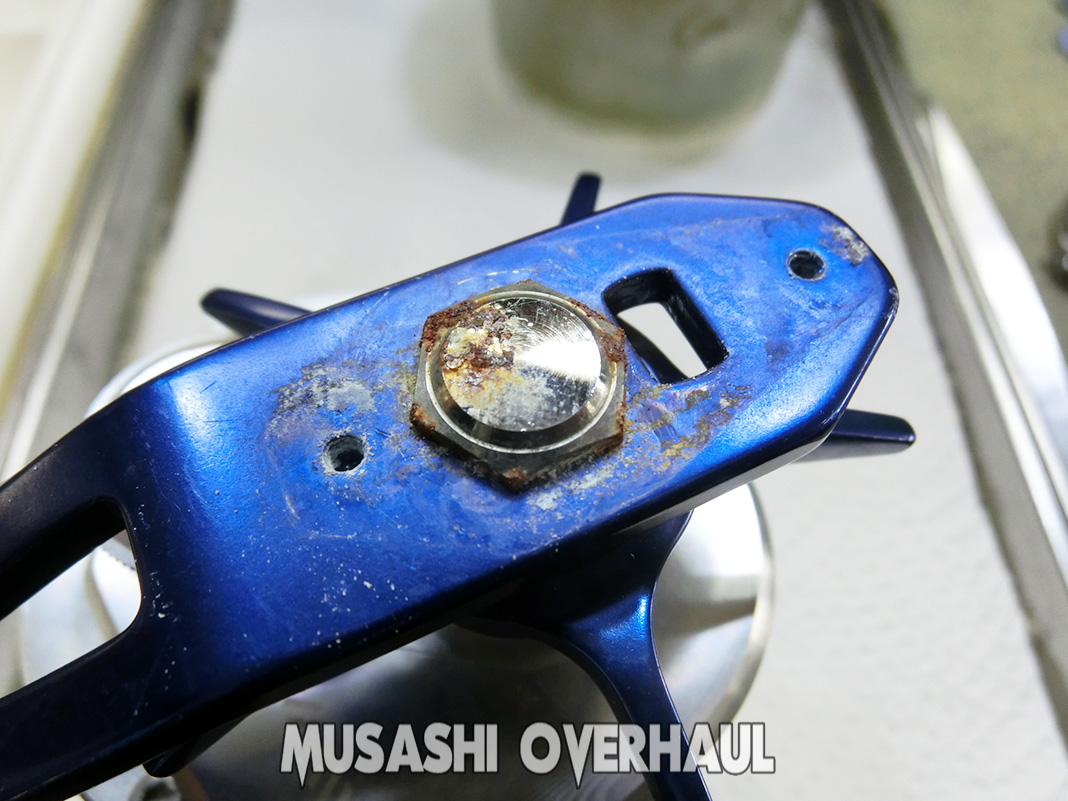 内部は錆び錆びでロックしており もの凄い異臭を放っております。これぐらいの見た目、車 や バイク でしたら普通ですが リール の場合は繊細なので かなり酷いレベルです。錆害に関しては こちら にて纏めていますので参考ください。