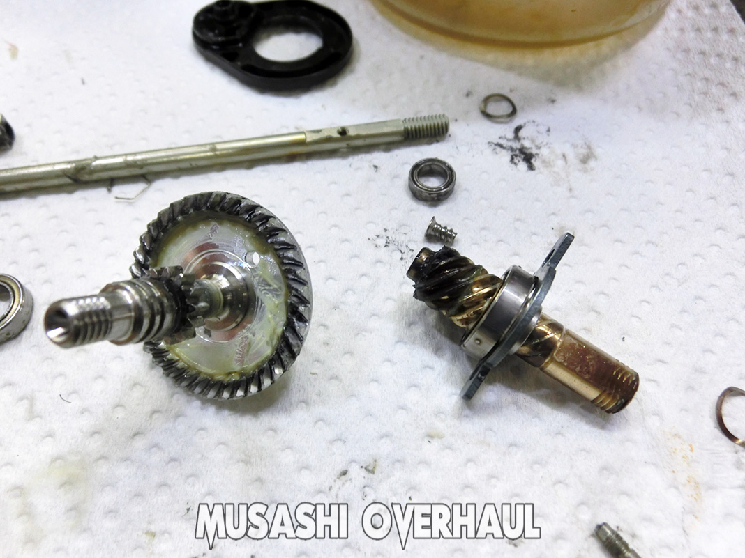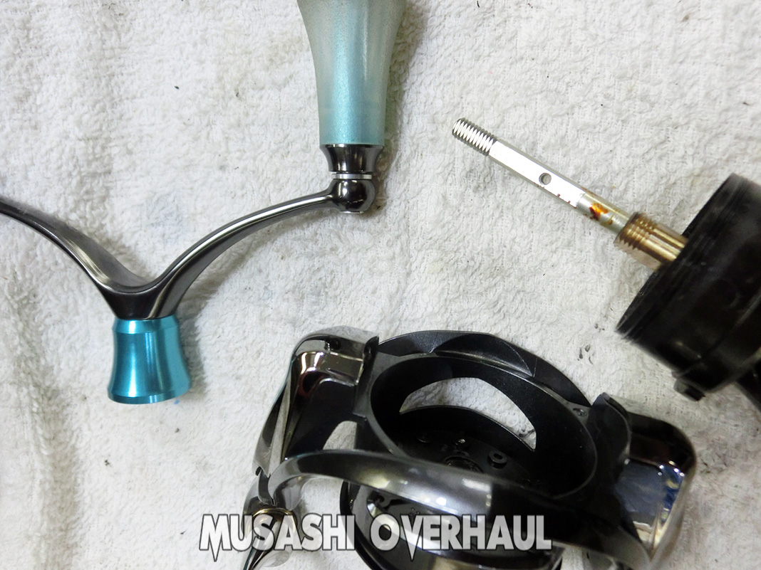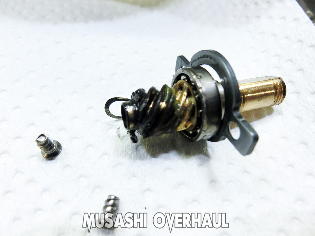 スピニングリールの大きな難点は2つあります。ピニオンギア の摩耗 と メインシャフト の ブレ です。これらの部品は 研磨 や 補正 では治せません。それなので 大体メンテナンス の出す時点で 高額となってしまいます。しかも2つセット で交換が必要となります。