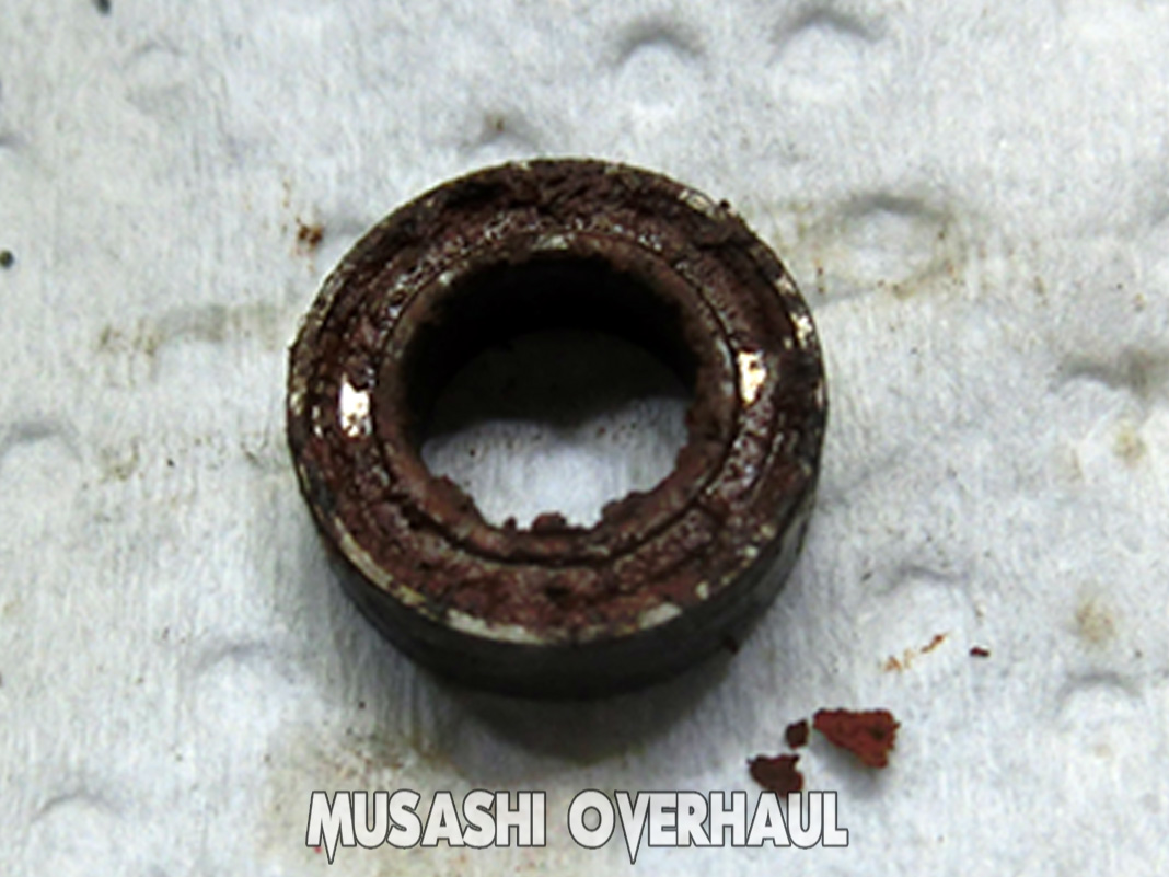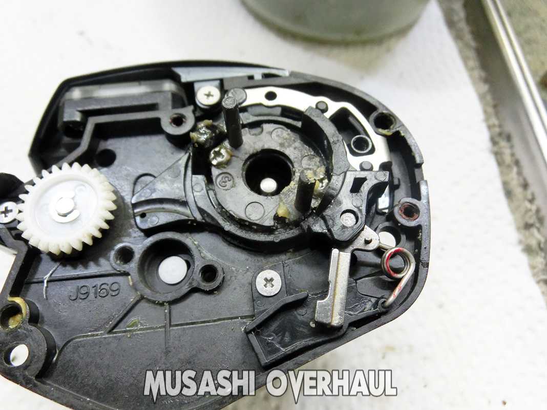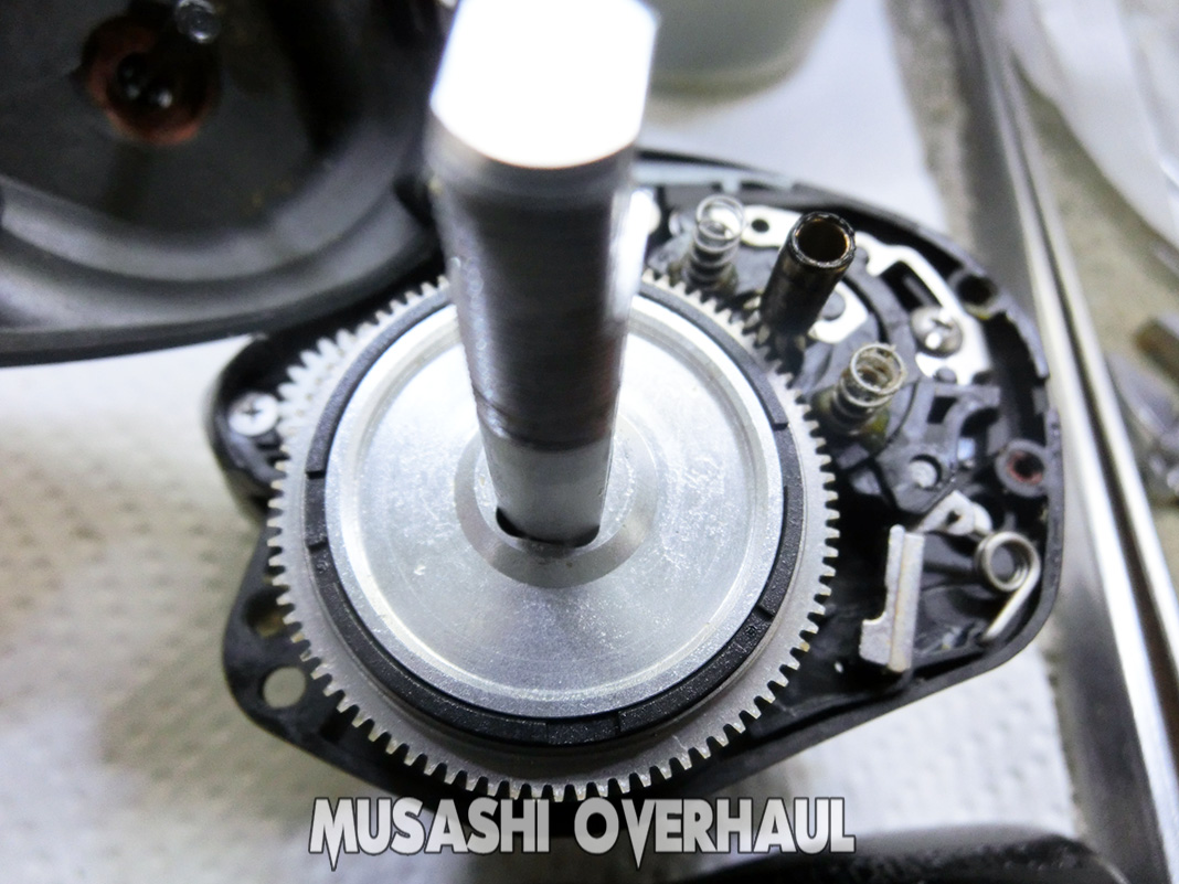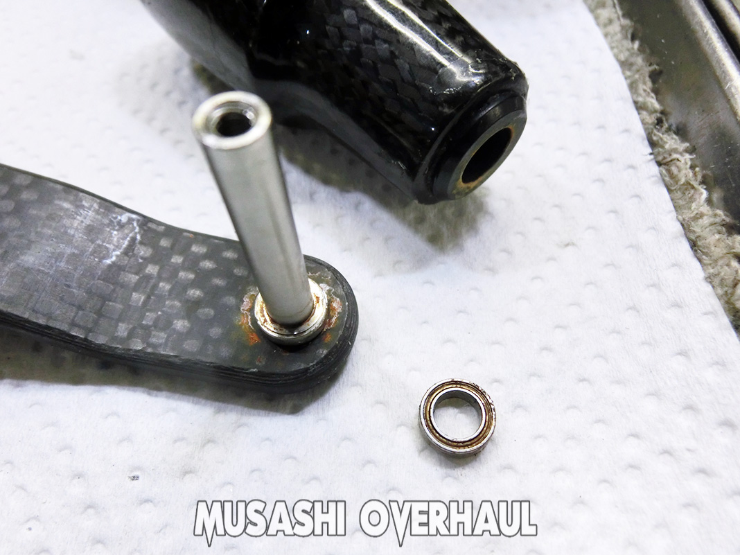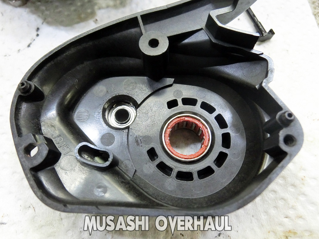 ピニオンギアの根元ベアリングもズボッ~と抜けて錆びだらけでした。これぐらいの見た目、車 や バイク でしたら普通ですが リール の場合は繊細なので かなり酷いレベルです。錆害に関しては こちら にて纏めていますので参考ください。