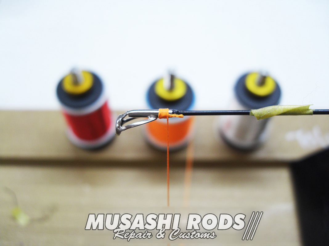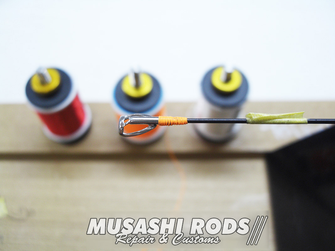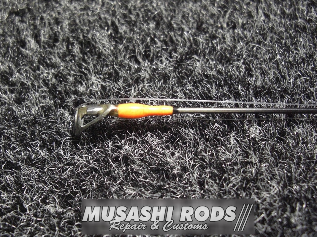 今回は 無名ブランド のガイドを巻き直します。トップ から ティップセクション までを 蛍光スレッドティップラン仕様 に巻き替えます。ガイドは使い手が知らないうちに 曲がったり割れたりしてしまいます。ムサシロッド リペア&カスタムズ では あなたのロッドを希望通りに カスタム 致します。