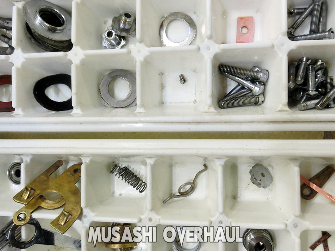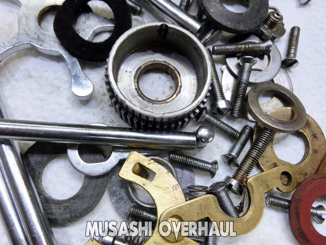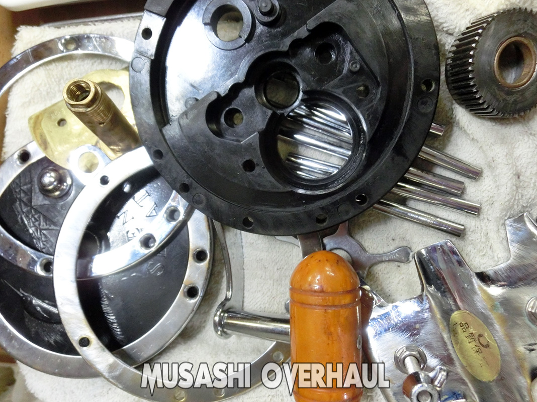 まずは部品の精査をしながら 洗浄&磨き をかけます。今回のこういった 作業は簡単そうに見えますが 実は一度 他人が触ったリールはとても大変な作業になる事もありますね。