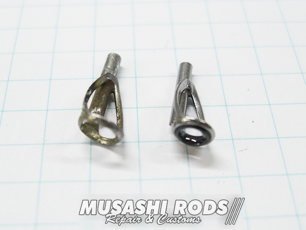 今回の交換するガイドです。最上級の フジ工業製 トルザイト T-LGTT 4-1.4 (1250円) ガイドです。左が古いガイドで SICリング が紛失してありません。