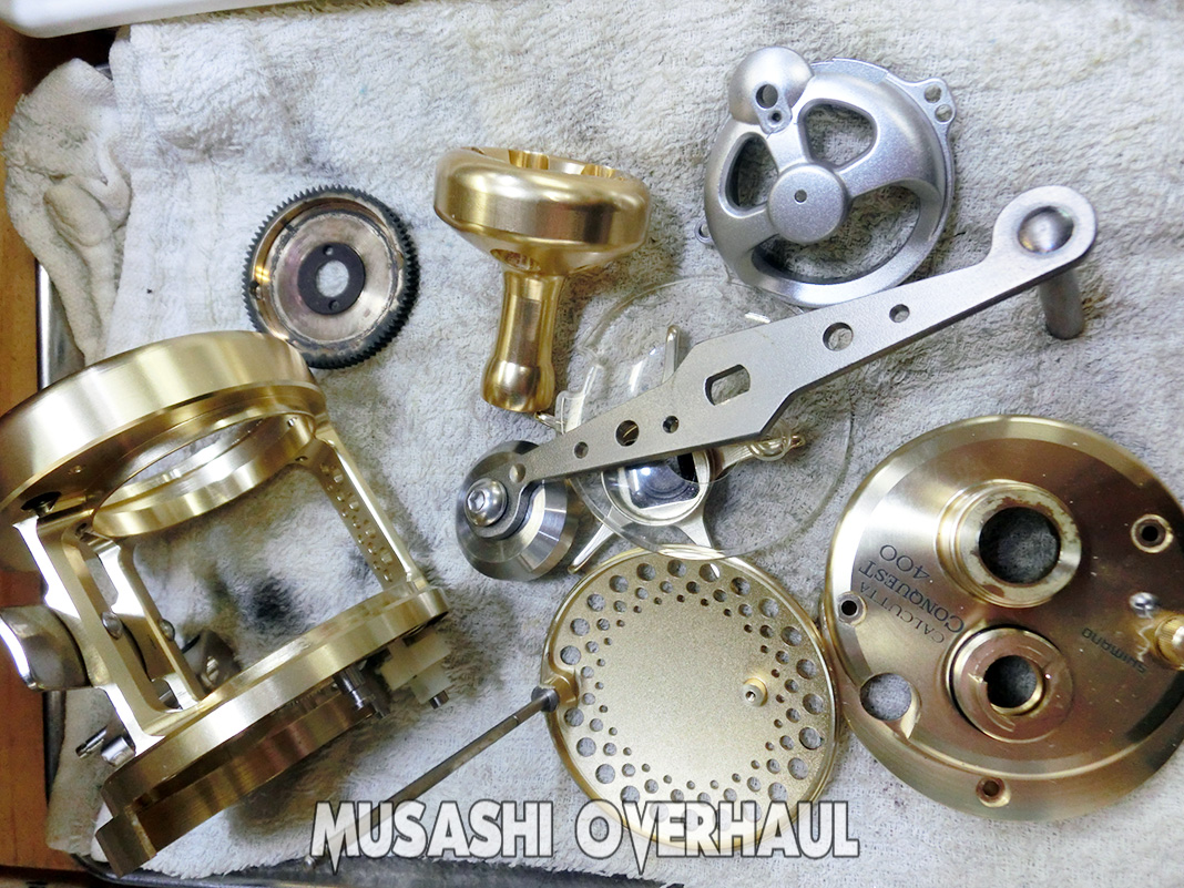 オーバーホール で受付けしました シマノ 01 カルカッタコンクエスト 400 (RH444) です。ハンドルを回転させると異音があり 内部がとても重い感じがします。自身でオーバーホールしてから 調子が悪い… 近所に釣具店が無い… このような ケースでお困りの方は お問い合わせ ください。ムサシオーバーホール 事業部ではスペアパーツも 豊富に在庫があります。