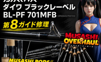 今回は ダイワ ブラックレーベル PF 6101 LRB (01404001) の第3ガイドを修理 します。ガイドが抜けてしまったそうです。ムサシロッド リペア&カスタムズ では あなたのロッドを希望通りに 修理カスタム 致します。ロッド釣竿...
