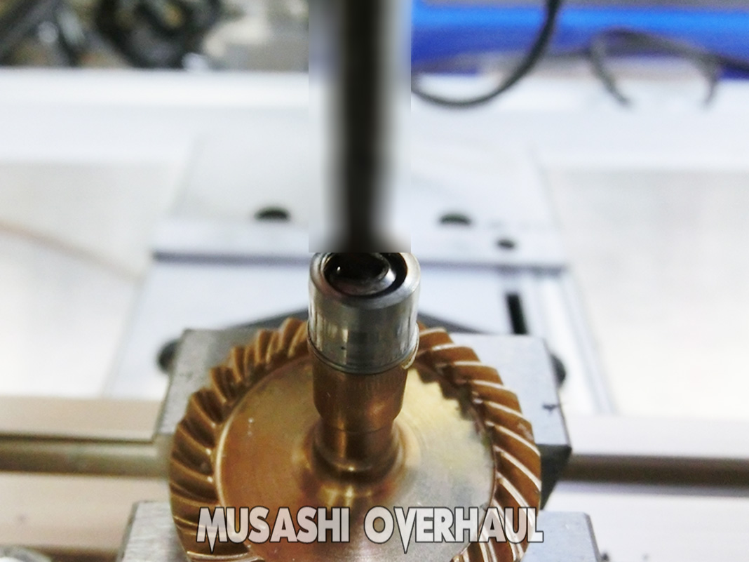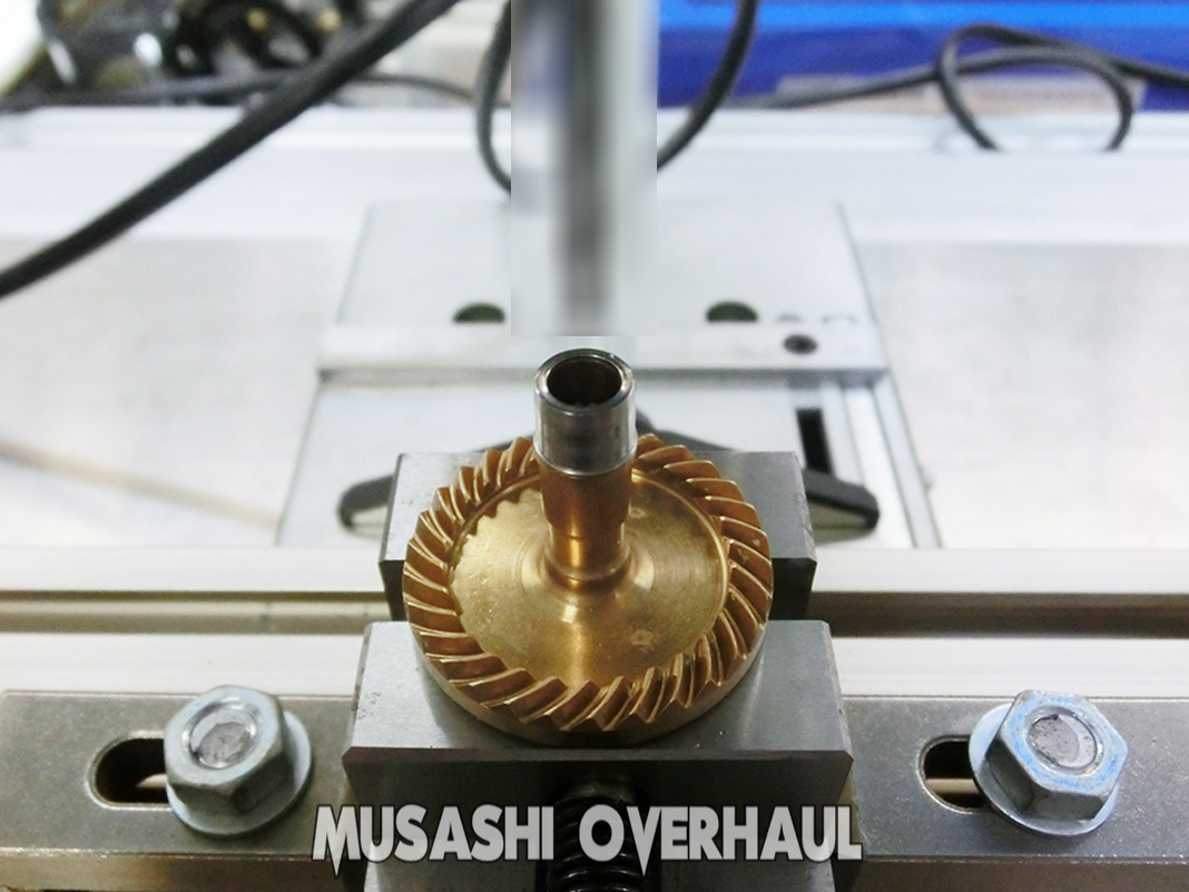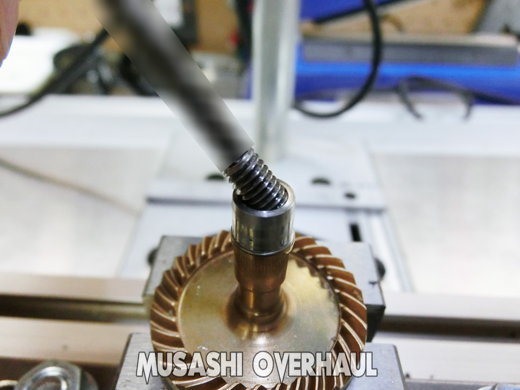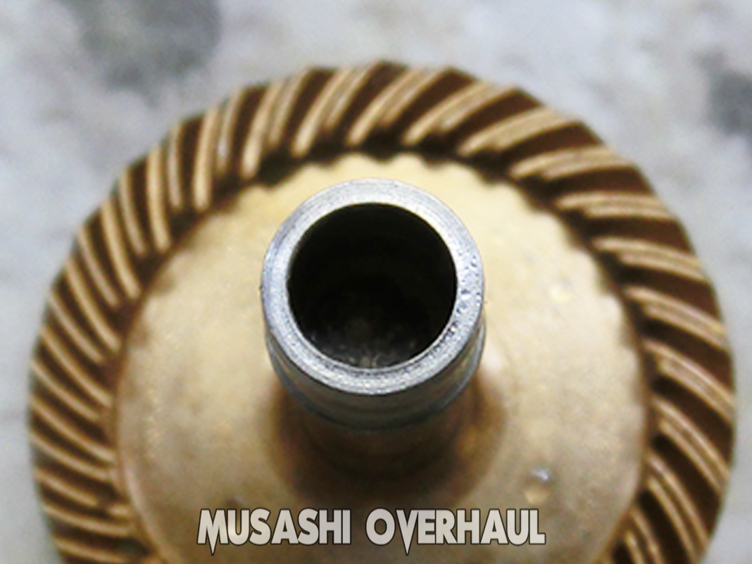 サンドペーパーで研磨 するのではなく 塩素系溶液を混ぜた コンパウンド で研磨します。肌の調整というか 空気の調整みたいな作業と呼んだ方が掴みやすいと思います。ここで メインシャフト と ピニオンギア の間にクリアランスが発生してしまった場合は オイルを使用して 微調整 が必要です。