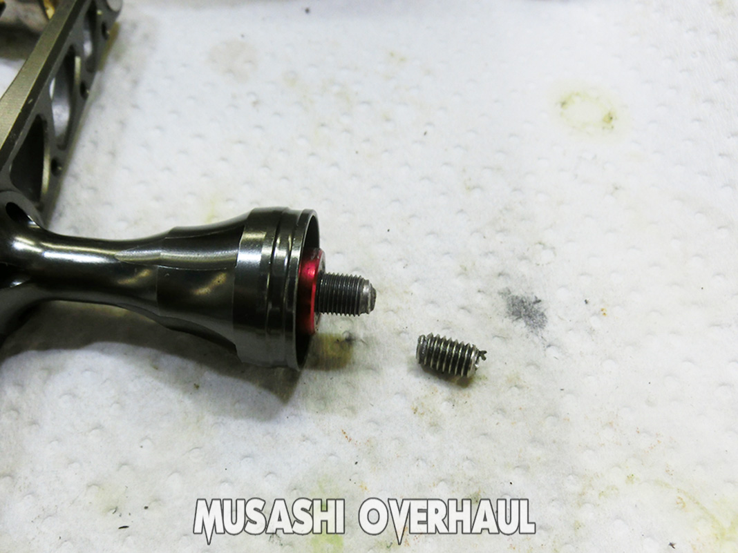 今回は、リールの修理でよくあるネジ(ボルト)折れの救出作業です。舐めたネジや折れたネジの取り外しは簡単そうに見えますが、実際には知識や経験が必要となります。まず、スピニングリールのハンドルの構造は、左右どちらにも装着できるよう、ダブルスレッド(両側ネジ切り)仕様となっています。