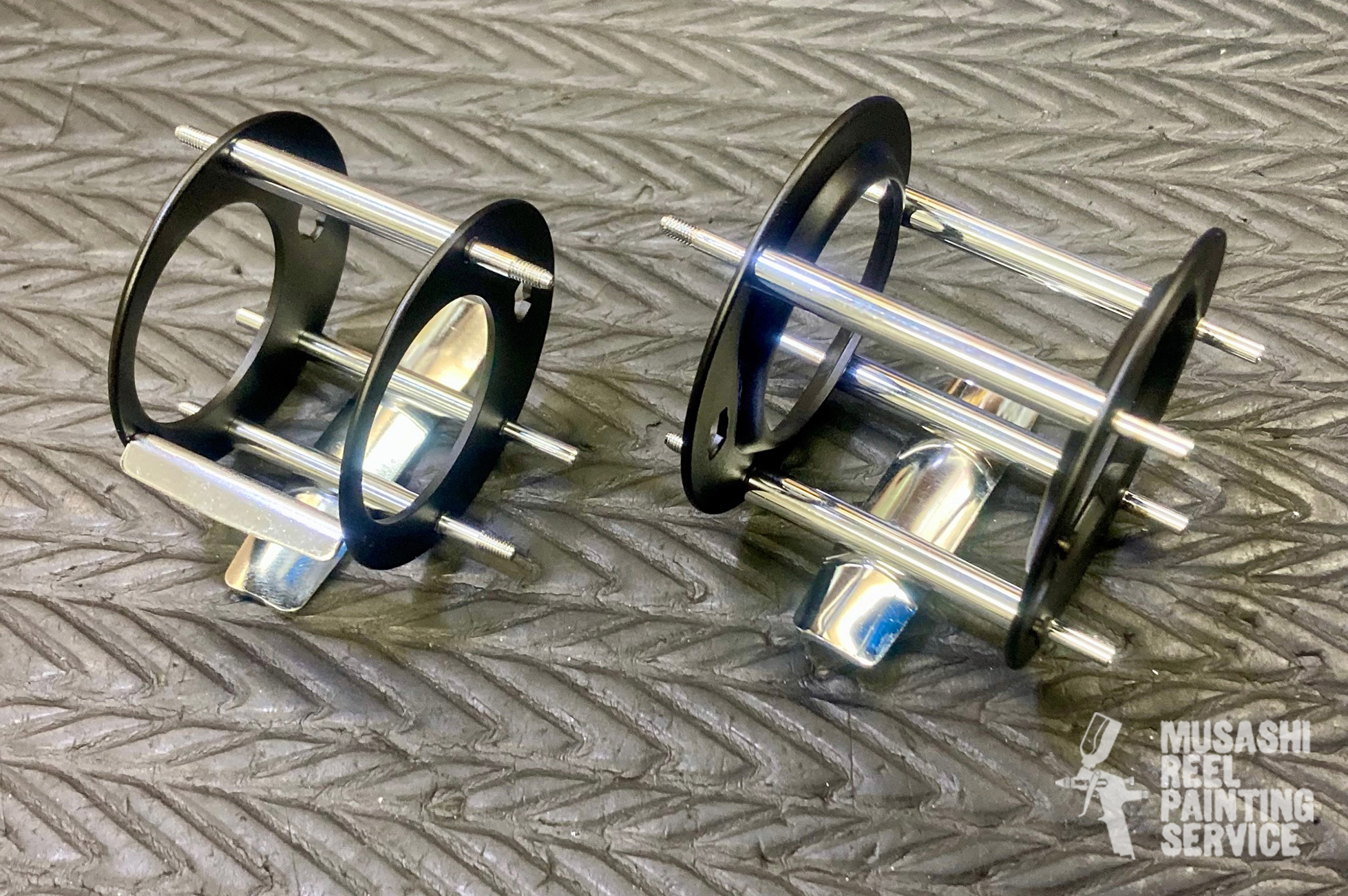 シマノ メタニウムMGL を 艶有りブラック&艶無しブラック で塗装。ボディはツヤツヤ、ハンドル&メカニカルノブ、キャップはカサカサ。同じカラーですが、メリハリが付けれます。今回の施工代金は23000円となります。