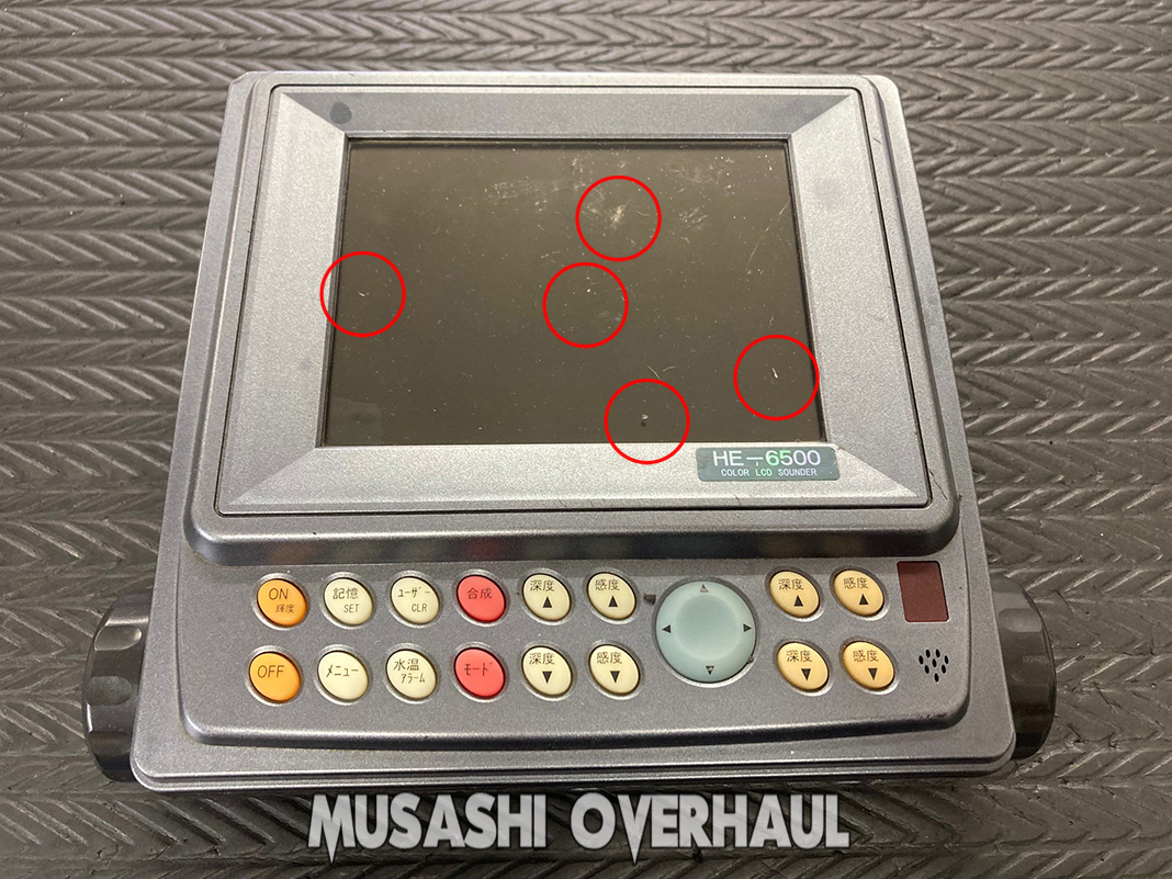 今回はメンテナンス修理オーダー頂きました HONDEX ホンデックス HE-6500 (4721580364581) の画面を修理します。画面に傷があり気になってしまうそうです。メーカーさんも既に受け付けてくれません。近所にメンテナンス店が無い… このような ケースでお困りの方はこのような ケースでお困りの方は ムサシオーバーホール (財団法人 尾道海技学院 4ストロークエンジン マリン整備士講習終了認定) まで お問い合わせ ください。